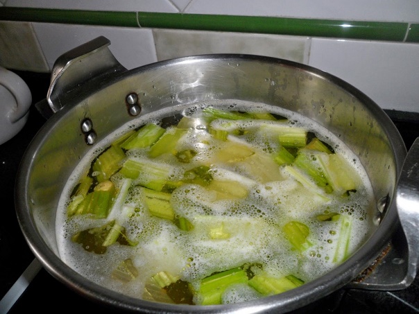Corte o talo em vários pedaços e leve para ferver em 1 litro de água.