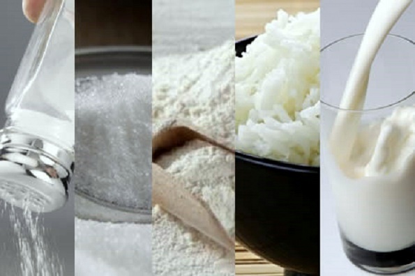Estamos falando do arroz branco, sal refinado, leite de vaca pasteurizado, açúcar refinado e farinha de trigo branca.