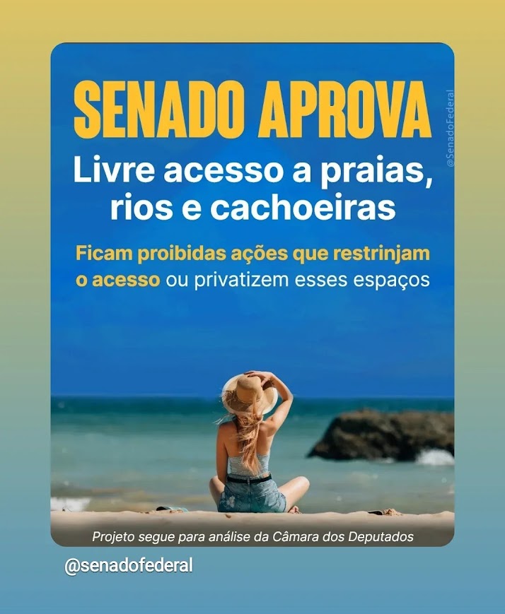 O Senado aprovou nesta semana projeto de lei que garante o livre acesso a praias, cachoeiras e outras áreas naturais públicas de grande beleza ou interesse turístico (PL 2/2021). De acordo com o texto, o Estatuto da Cidade, de 2001, passará a assegurar expressamente o acesso a locais naturais públicos, com a proibição de ações que restrinjam ou privatizem esses espaços. O projeto segue para análise da Câmara dos Deputados.