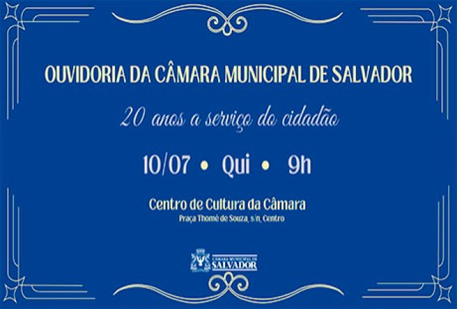 “Ouvidoria da Câmara Municipal de Salvador – 20 anos a serviço do cidadão”. Esse é o nome da atividade que será realizada no dia 10 de julho para celebrar as duas décadas de atuação da Ouvidoria do Legislativo da capital baiana. A cerimônia será conduzida pelo ouvidor-geral da Casa, vereador Hélio Ferreira (PCdoB), a partir das 9h, no Centro de Cultura Vereador Manuel Querino, na Praça Thomé de Souza.