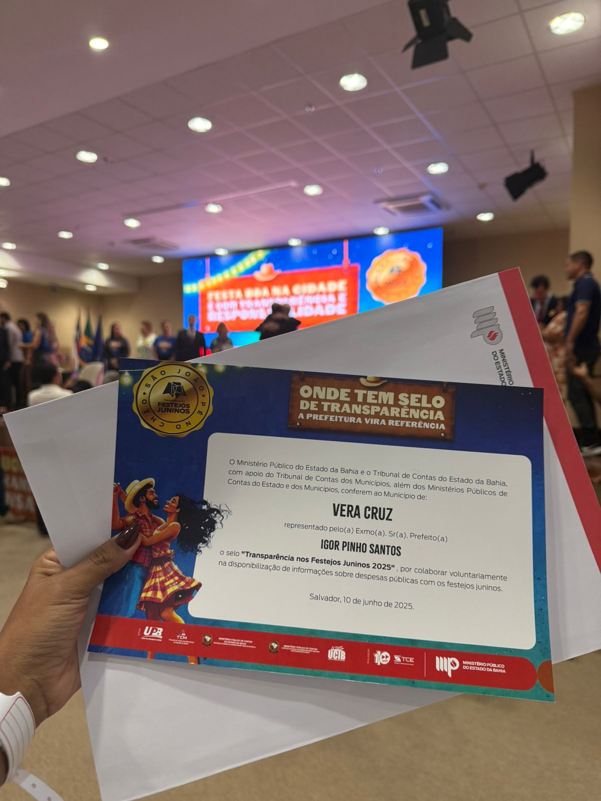 A Prefeitura de Vera Cruz reafirmou seu compromisso com a transparência e o uso responsável dos recursos públicos ao aderir ao Portal da Transparência dos Festejos Juninos, iniciativa promovida pelo Ministério Público da Bahia (MP-BA). A adesão, que envolveu todos os 417 municípios baianos, foi reconhecida nesta segunda-feira (17) com a entrega do Selo dos Festejos Juninos – São João Pé no Chão, concedido à gestão municipal por meio da Controladoria.