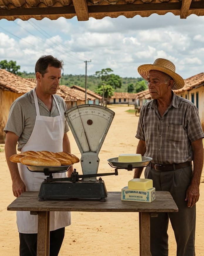 — Não, senhor. Não tenho balança profissional. O que eu faço é simples: todas as manhãs o padeiro me vende uma libra de pão, e eu uso esse mesmo pão como referência para lhe entregar a mesma quantidade em manteiga.