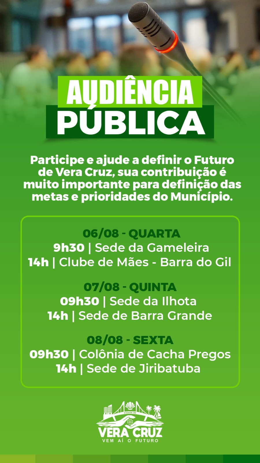 A Prefeitura de Vera Cruz convida toda a população para participar da próxima Audiência Pública, um momento fundamental de diálogo, escuta e construção coletiva. O encontro será dedicado à discussão de um tema de grande relevância para o desenvolvimento da cidade, com impacto direto na vida da comunidade.