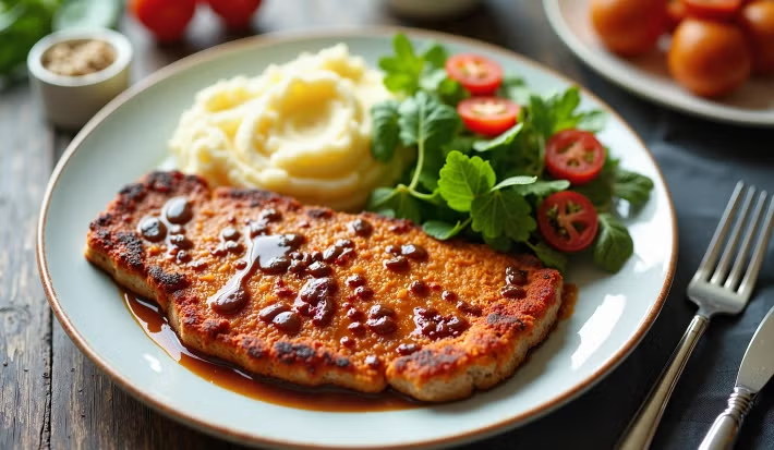 Carne à Milanesa em Molho de Vinho Tinto com Purê de Batata e Cenoura