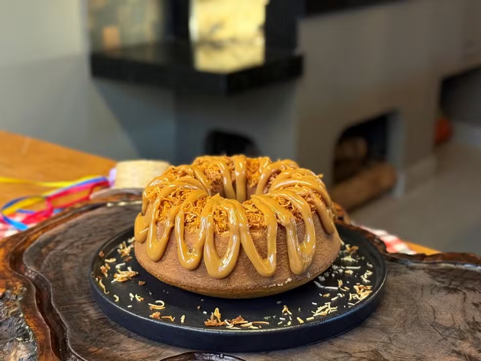 - 6Despeje a calda em uma forma com furo central e adicione 100 gramas de coco ralado.