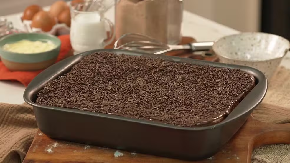 - 2Transfira para uma forma untada com margarina e chocolate em pó.