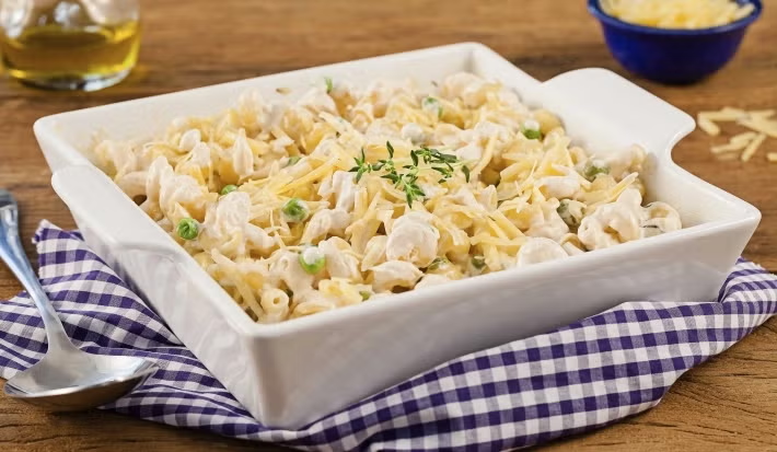 - 1.Em um recipiente refratário, misture o macarrão, o Leite NINHO, o queijo mozarela, as ervilhas, o sal, a noz-moscada e o tomilho.