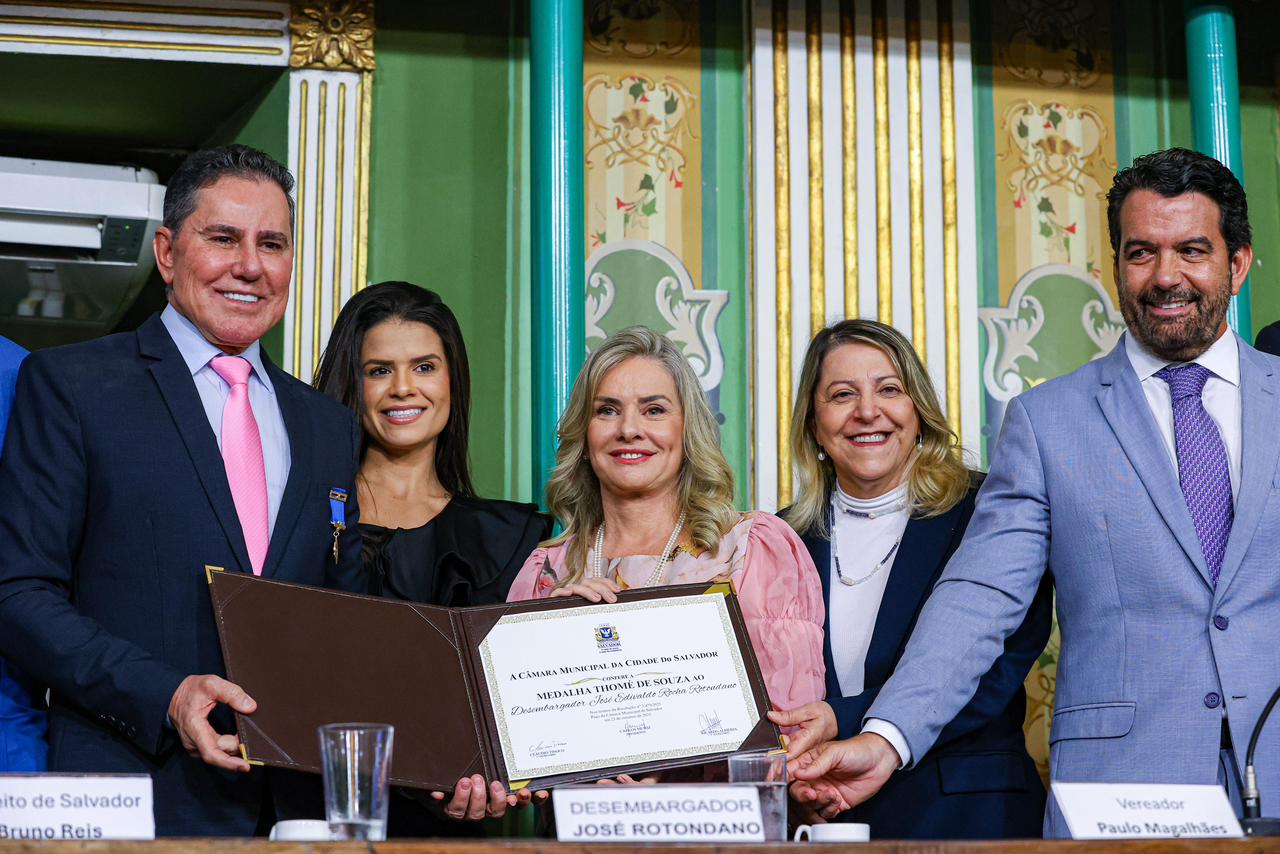 A presidente da Assembleia Legislativa da Bahia, deputada Ivana Bastos, participou na manhã desta sexta-feira (24), da Sessão Solene da Câmara Municipal de Salvador que concedeu a Medalha Thomé de Souza ao desembargador do Tribunal de Justiça da Bahia, José Edivaldo Rocha Rotondano. A honraria, uma das mais importantes do Legislativo soteropolitano, é concedida a personalidades que prestam relevantes serviços à cidade e ao Estado.
