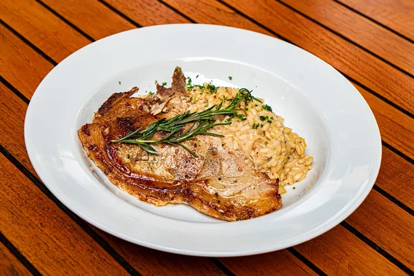 Risoto de gorgonzola com bisteca suína