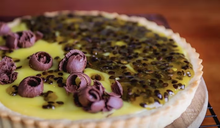 - 19.Retire o aro da torta já fria e espalhe o creme de maracujá sobre o recheio de chocolate, nivelando bem.