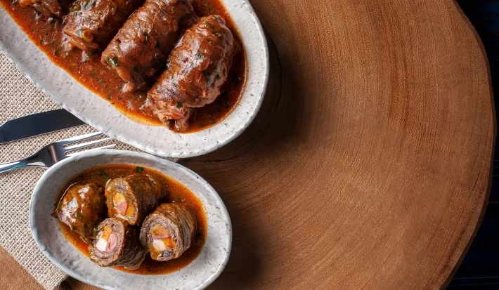 Rolinho de bife com molho barbecue é aquela receita cheia de sabor e personalidade. Os bifes finamente cortados são recheados, enrolados e selados até ficarem dourados por fora e suculentos por dentro. O grande destaque é o molho barbecue, que traz o equilíbrio perfeito entre doce, ácido e defumado, criando uma camada caramelizada irresistível. Fácil de preparar, essa receita funciona tanto como prato principal quanto como petisco para impressionar.