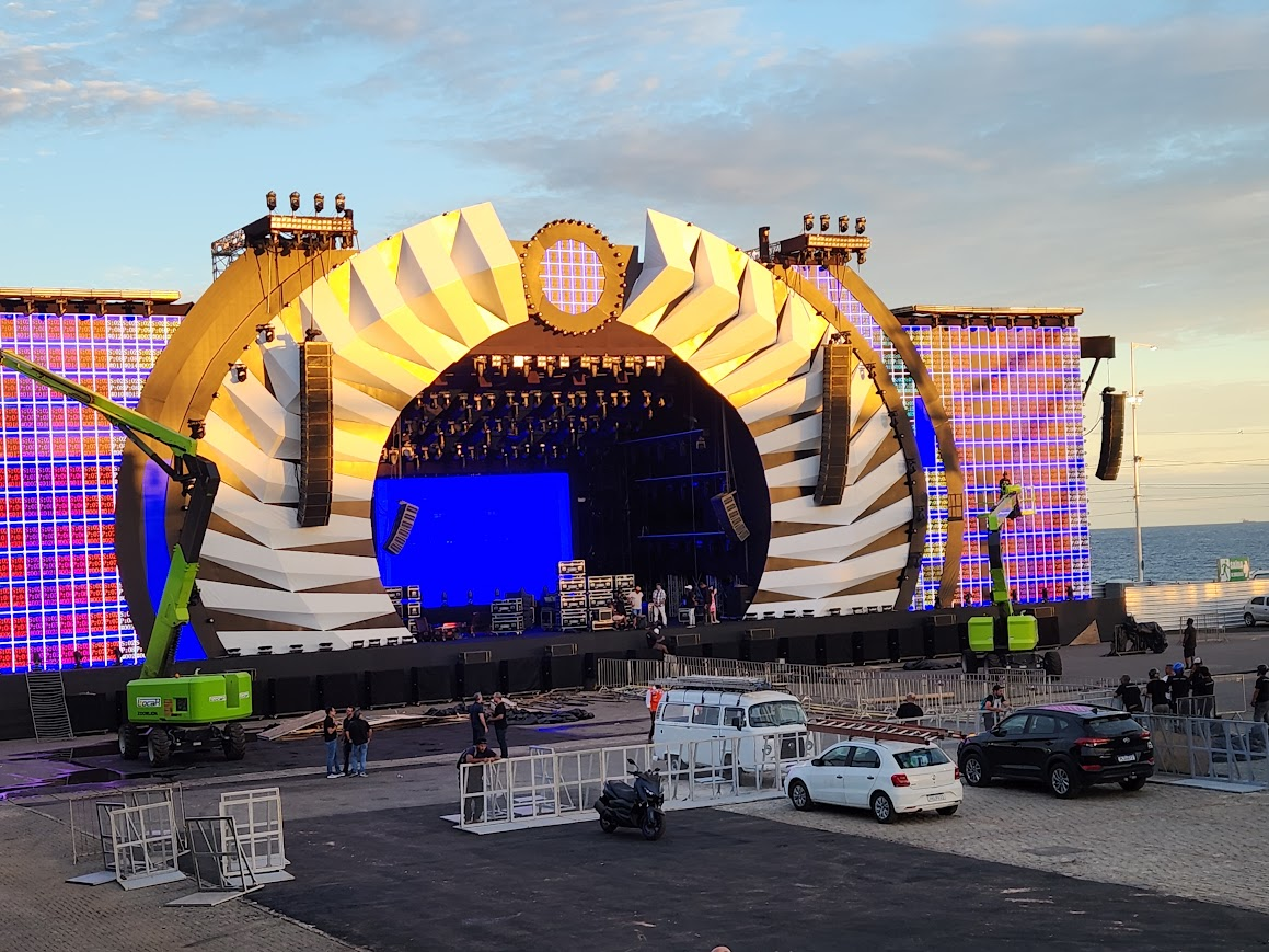 Com formas circulares e elementos radiais, o Palco Sol representa o movimento do tempo e o fechamento de um ciclo. A estrutura funciona como um grande relógio, que ganha protagonismo no dia 31 de dezembro, quando se transforma no centro visual da contagem regressiva para o novo ano, integrando cenografia, iluminação e tecnologia ao momento mais esperado da festa.