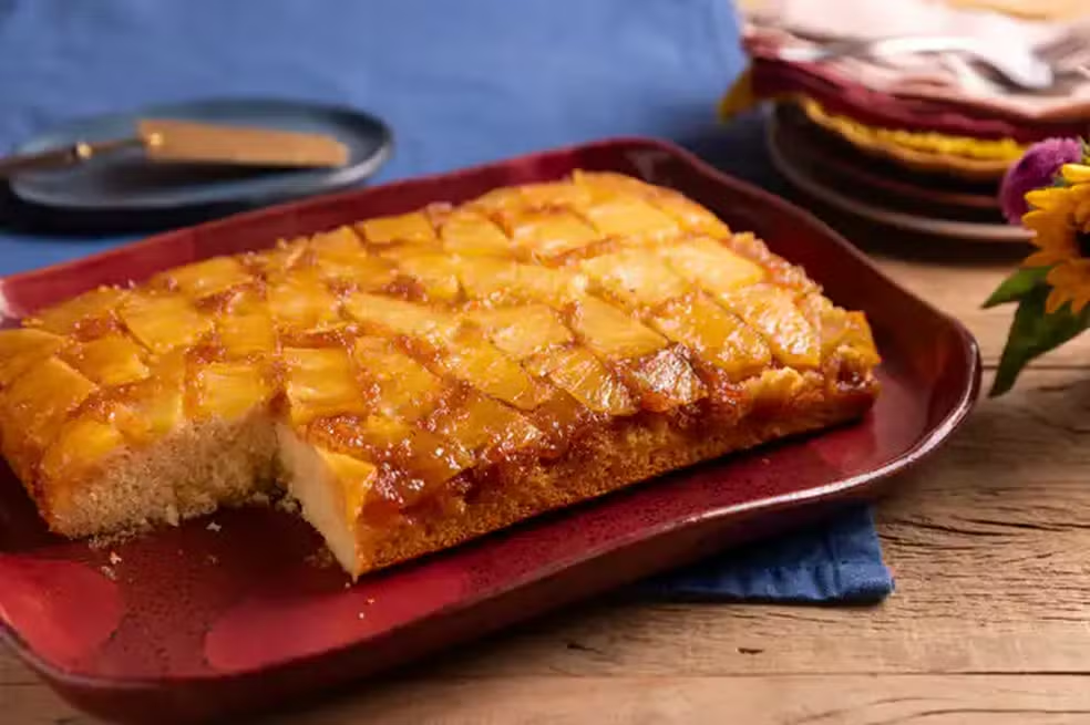 - 7Distribua as fatias de abacaxi sobre a calda, uma ao lado da outra, até completar toda a fôrma. Reserve.