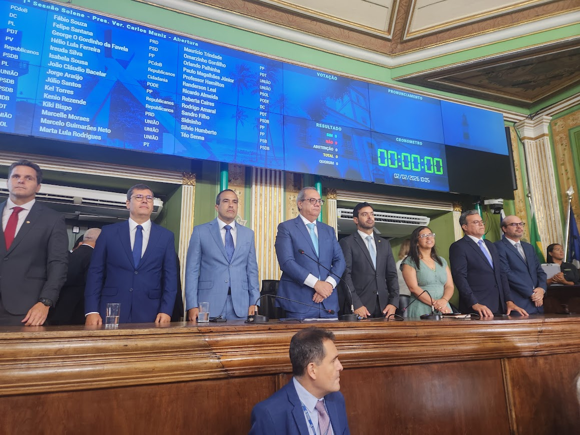 A Câmara Municipal de Salvador reabriu, nesta segunda-feira (2), os trabalhos legislativos de 2026. A sessão solene foi conduzida pelo presidente da Casa, vereador Carlos Muniz (PSDB), no Plenário Cosme de Farias, e contou com a presença do prefeito Bruno Reis, responsável pela leitura da Mensagem do Executivo.