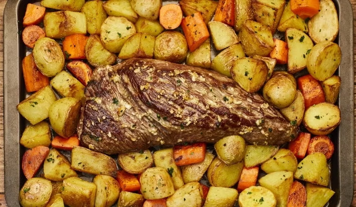 - 7.Sirva a maminha com as batatinhas e as cenouras assadas.