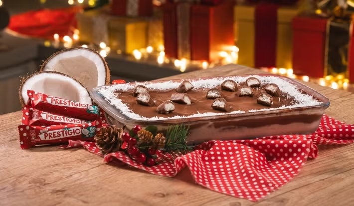 - 10.Decore a parte superior com coco ralado e pedaços de Chocolate PRESTÍGIO picados.