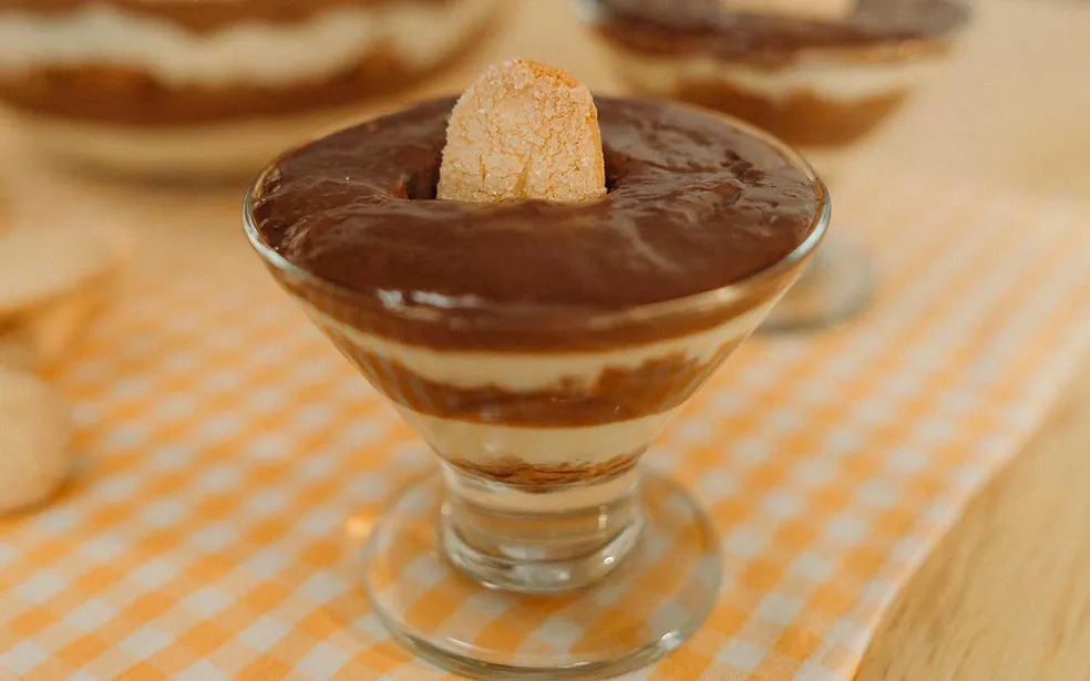 - 3Depois, intercale camadas de creme branco e creme de chocolate.